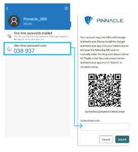 6. Enter the code from Google Authenticator to Authenticator code field on Pinnacle 365.