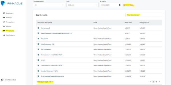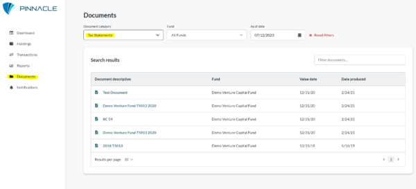 • Under document category filter for “Tax Statements”. Further filtering of investor or fund will narrow down the search results.