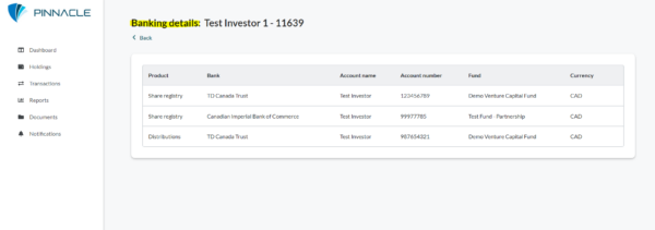 • All applicable banking information for the respective Fund and Investor will appear in the table.  Note that this information is in summary form – the full details are not displayed on screen.